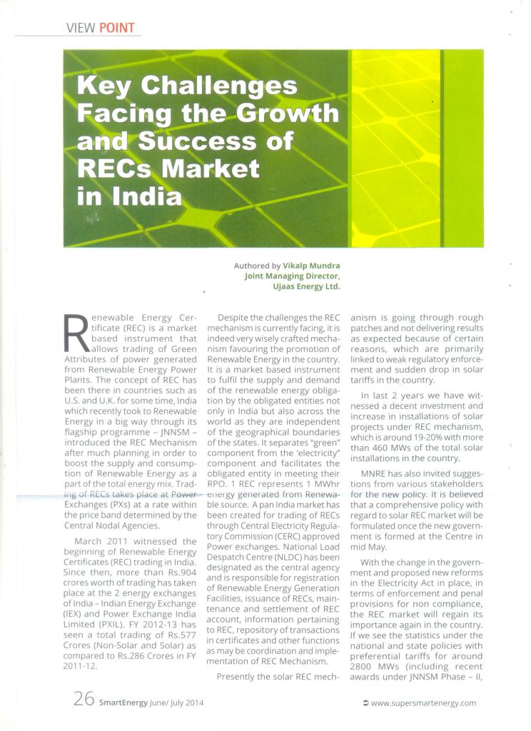 Jun. 2014, Key challenges facing the growth and success of RECs market in India, in the issue of Smart Energy Magazine.